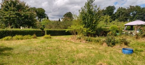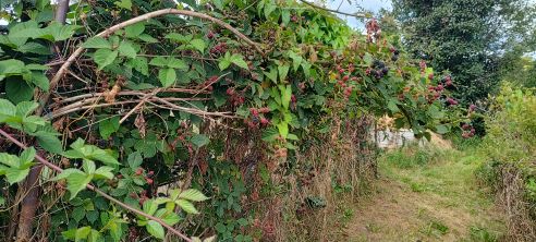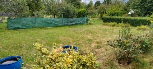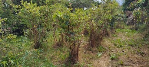 Na działce nasadzenia: borówki amerykańskie (10 sztuk), maliny, jeżyny, pigwa (2 sztuki), jabłoń.