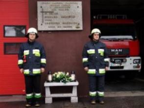 Na zdjęciu : W tym szczególnym dniu powracają wspomnienia o kolegach, których już wśród nich nie ma. Warta honorowa przy tablicy tragicznie poległych w akcji strażaków Grzegorza Maksajdy i Ryszarda Bronieckiego, którzy zginęli 6 września 1989 roku podczas pamiętnego wielkiego pożaru w Jezierzycach.