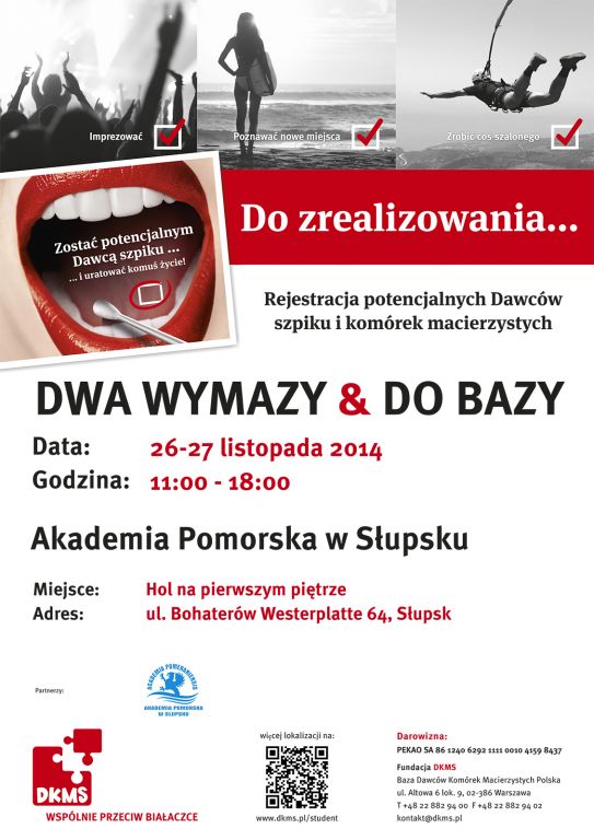 Projekt DWA WYMAZY & DO BAZY to wielkie przedsięwzięcie, niespotykane w skali światowej, zorganizowane przy współpracy i ogromnym wsparciu Studenckich Ambasadorów Fundacji DKMS Polska. Delegaci 128 uczelni z całej Polski, zaangażowani emocjonalnie, merytorycznie przygotowani przez Fundację DKMS Polska, będą przez dwa dni listopada rejestrować potencjalnych dawców komórek macierzystych krwi lub szpiku. Fundacja DKMS Polska to największa w Polsce baza takich dawców. Bazując na bardzo pozytywnym doświadczeniu trzech poprzednich edycji tej studenckiej inicjatywy, które łącznie dały wynik około 37.000 nowych potencjalnych dawców, Fundacja DKMS Polska razem ze studentami podejmie się kolejnej próby pozyskania osób, dla których los chorych na raka krwi pacjentów nie jest obojętny.