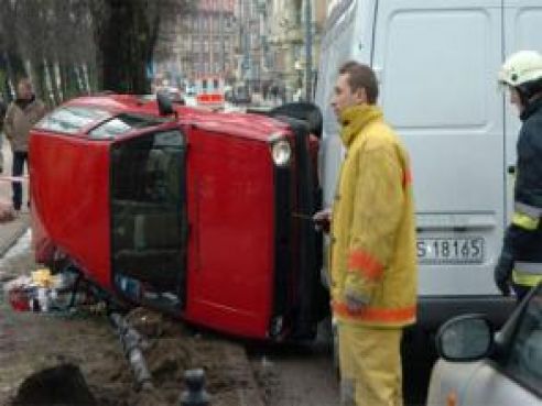Kierujący mercedesem z impetem uderzył w tył volkswagena. Uderzenie było tak silne, że auto skosiło trzy słupki oddzielające chodnik od jezdni, a następnie przekoziołkowało i zatrzymało się na drzewie. Z baku pojazdu zaczęło wyciekać paliwo, a z silnika olej. Na miejscu wypadku pojawili się strażacy, którzy usunęli zanieczyszczenia. Poszkodowani w wypadku nie mogli się doczekać karetki, która zabrałaby ich do szpitala. Po krótkiej naradzie zostali zawiezieni tam strażackim wozem bojowym. (klotz)
