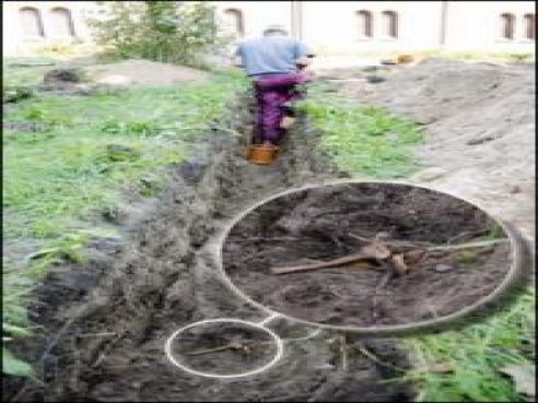 Na zdjęciu: Robotnicy, którzy znaleźli ludzkie kości, na polecenie proboszcza zaczęli je ponownie zakopywać.